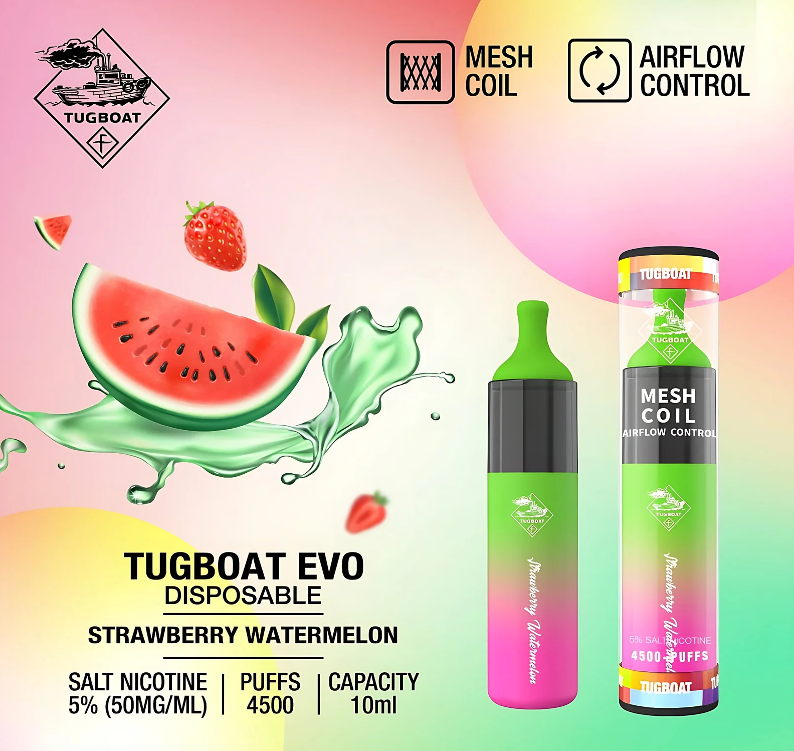 Thanks to its optimized battery and e-liquid capacity, the Tugboat Evo Disposable Vape is ideal for long sessions without frequent interruptions.